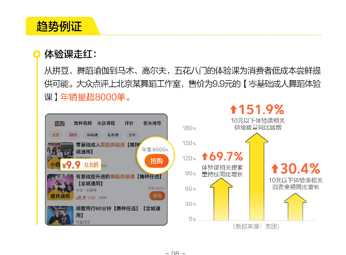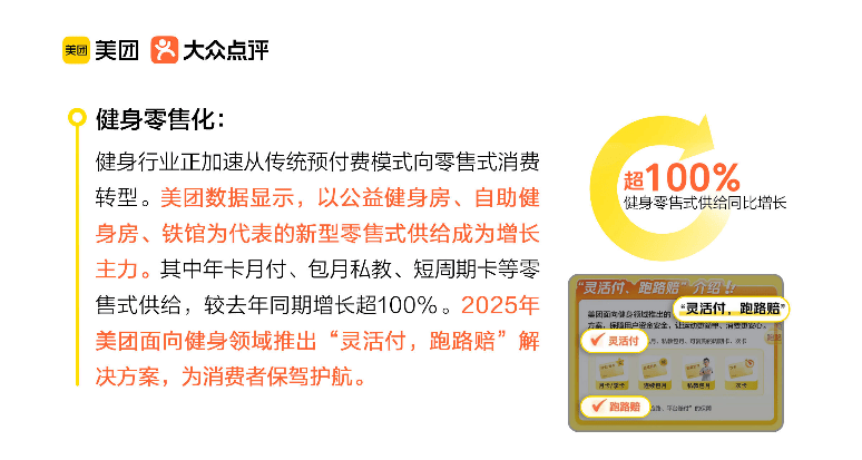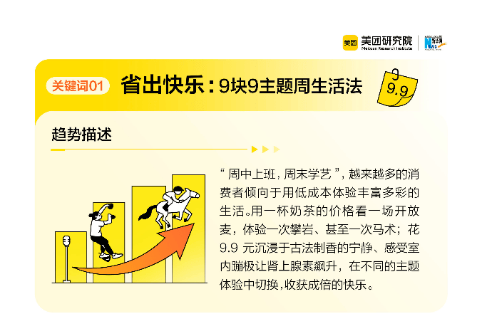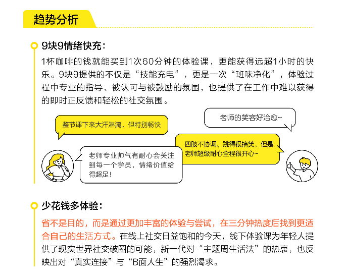 例如“省出快乐”关键词中,“9块9主题周生活法”并非单纯的价格敏感,而是通过一杯奶茶钱体验攀岩、马术、古法制香等小众活动,在短时间内切换多种生活场景,既满足了对新鲜感的追求,又以线下真实互动替代了线上社交的虚浮感。大众点评数据显示,9.9元舞蹈体验课年销量超8000单,印证了年轻人对“即时快乐”的刚需。而健身行业的“零售式转型”(如月付卡、短周期卡增长超100%)同样如此:消费者不再被年卡绑定,而是通过灵活支付尝试不同项目,最终找到适合自己的生活方式。这种“少花钱多体验”的本质,是通过高频低成本的试错,完成对自我偏好的认知,本质上是一种“体验型自我投资”。