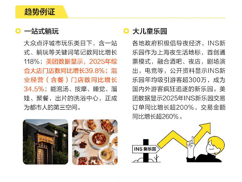 “重返附近”则是对“附近消失”现象的修复。当短视频和外卖让我们习惯“云端生活”,年轻人开始重新发现家门口的微度假场景:能泡汤、按摩、遛娃的一站式洗浴中心成为“第三空间”,融合酒吧、剧场、电竞的INS新乐园交易订单增长超200%。这种“短时间、近距离、高体验”的消费,本质上是对“抽离日常但不过度折腾”的精准满足——既不用长途旅行消耗精力,又能在熟悉的环境中获得新鲜感。人类学家项飙提出的“重建附近”,在这里得到了商业化的呼应:附近的商铺、社区活动、本地文化,正成为对抗焦虑与无意义感的情感锚点。
