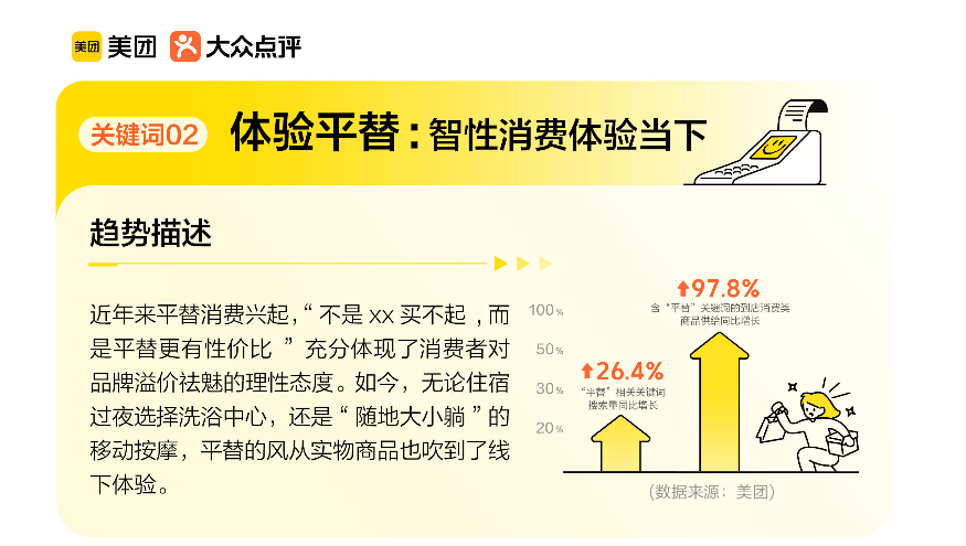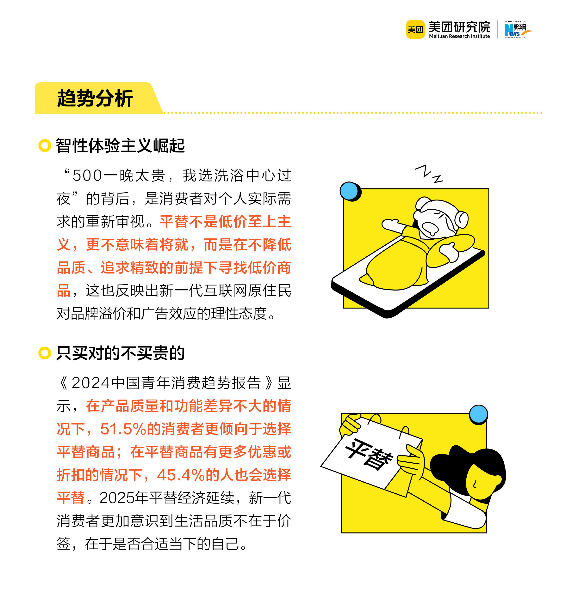 “体验平替”则进一步拆解了“品牌溢价”的神话。洗浴中心替代酒店过夜、共享按摩椅成为旅途中的“移动休息站”,表面看是选择更便宜的替代品,实则是消费者对“核心需求”的精准捕捉——过夜的本质是“休息+宵夜”,按摩的核心是“缓解疲劳”,而非必须为酒店的品牌LOGO或按摩店的装修溢价付费。报告显示,51.5%的消费者在产品质量相近时优先选择平替,45.4%会因平替的优惠折扣而转向,这种理性背后是对“生活品质=合适自己”的深刻理解,而非简单的“低价至上”。