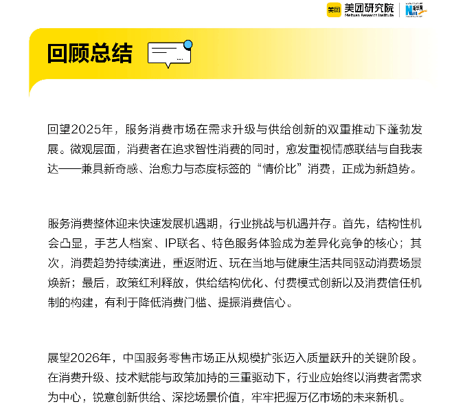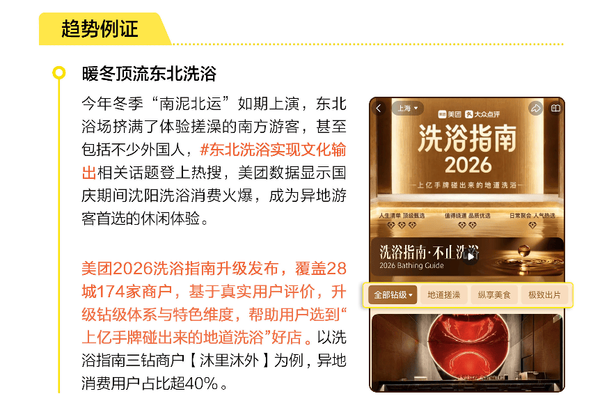 报告指出,行业的结构性机会将集中在三个方向:一是差异化竞争,如手艺人档案(个人IP)、IP联名(情感共鸣)、特色服务体验(如非遗搓澡)将成为商家脱颖而出的关键;二是场景焕新,重返附近、玩在当地与健康生活(内养外练)共同推动消费场景从标准化转向个性化;三是信任机制构建,通过付费模式创新(如灵活付、保障计划)与消费信任体系(如手艺人评价、城市玩乐榜单),降低消费者的决策门槛。