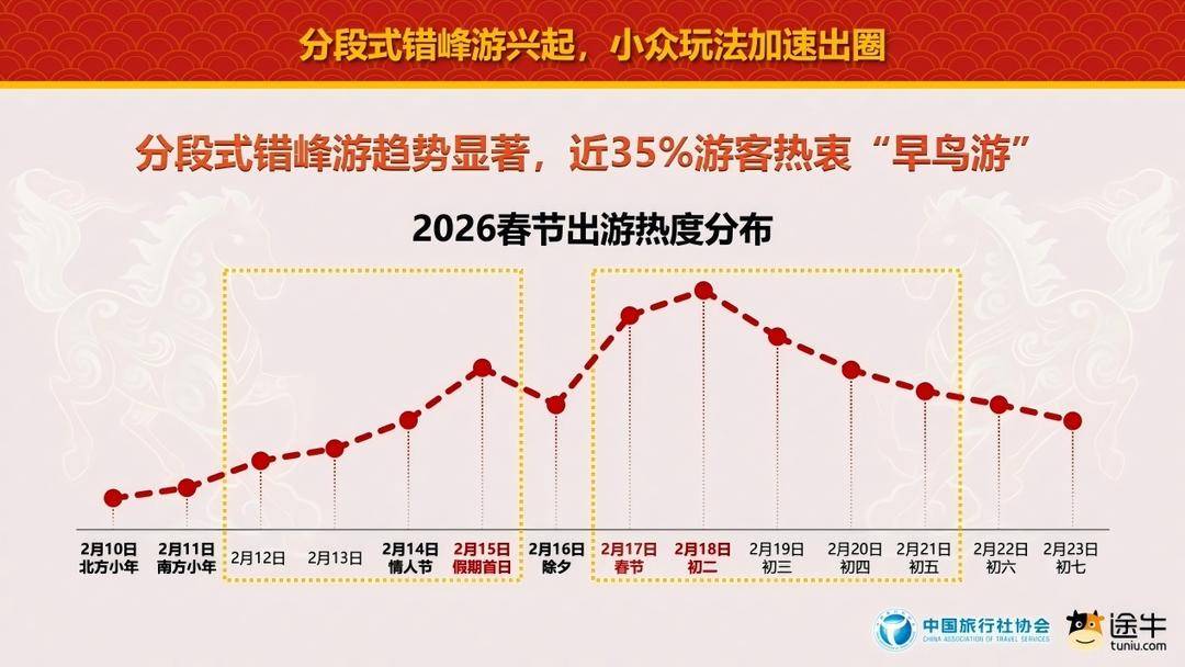 数据显示,今年春节假期,旅游用户分段式出游趋势明显,选择假期前错峰的早鸟游用户占比接近35%。第一波出游高峰始于南方小年(2月11日)后,第一波出游峰值在情人节及假期首日(2月15日),属于出游和返乡的叠加态。最新预订数据显示,预计大年初二(2月18日)将迎来今年春节假期的出游最高峰值。