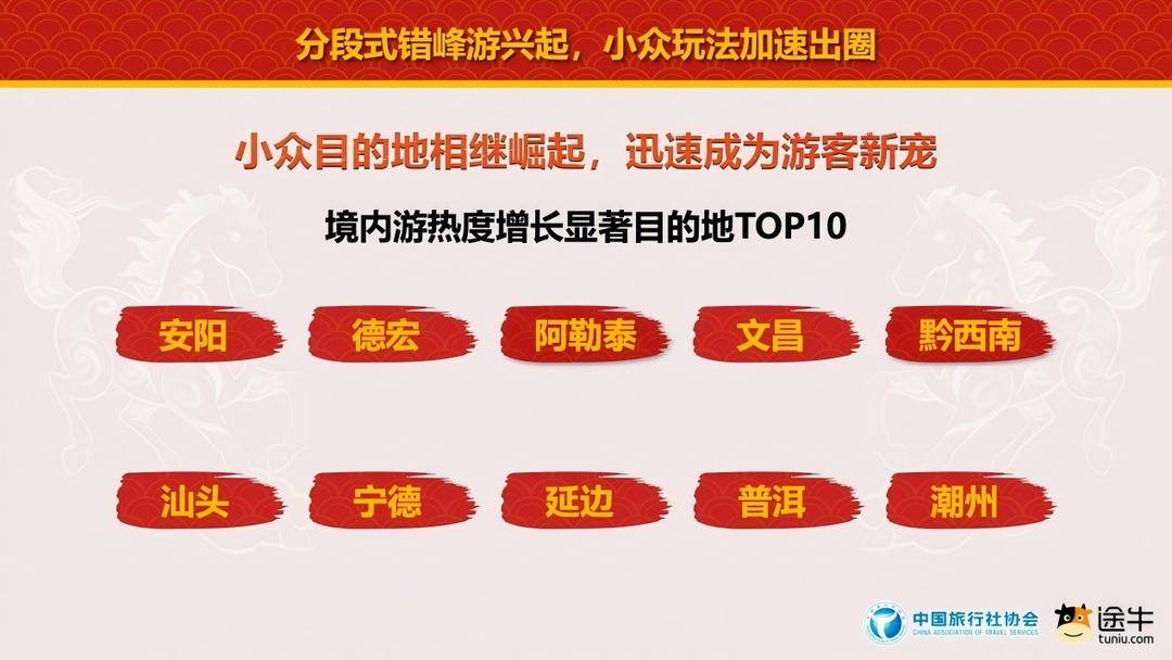新兴、小众目的地方面,途牛截至目前最新预订数据显示,安阳、德宏、阿勒泰、文昌、黔西南、汕头、宁德、延边、普洱、潮州等低线及县域城市预订热度增长显著。