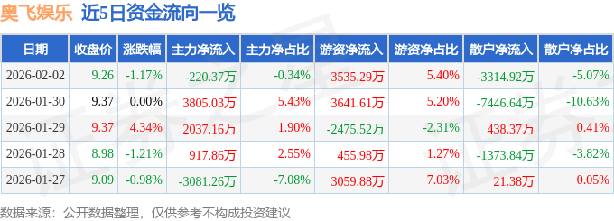 证券之星消息,截至2026年2月2日收盘,奥飞娱乐(002292)报收于9.26元,下跌1.17%,换手率6.82%,成交量69.45万手,成交额6.54亿元。
