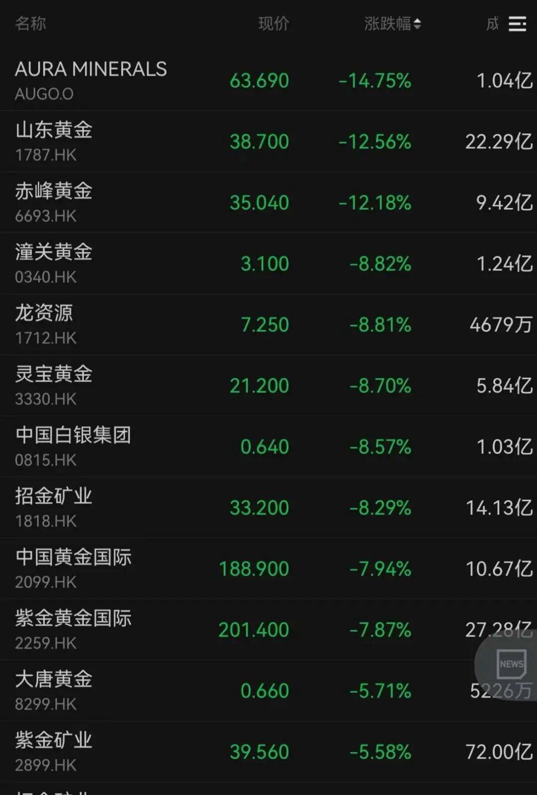 国际金价盘中大幅下挫,白银上演“断崖式”下跌。港股市场,黄金股“崩了”,有色金属股集体下挫。山东黄金、赤峰黄金跌超12%,潼关黄金、龙资源、灵宝黄金、中国白银集团等均收跌超8%。
