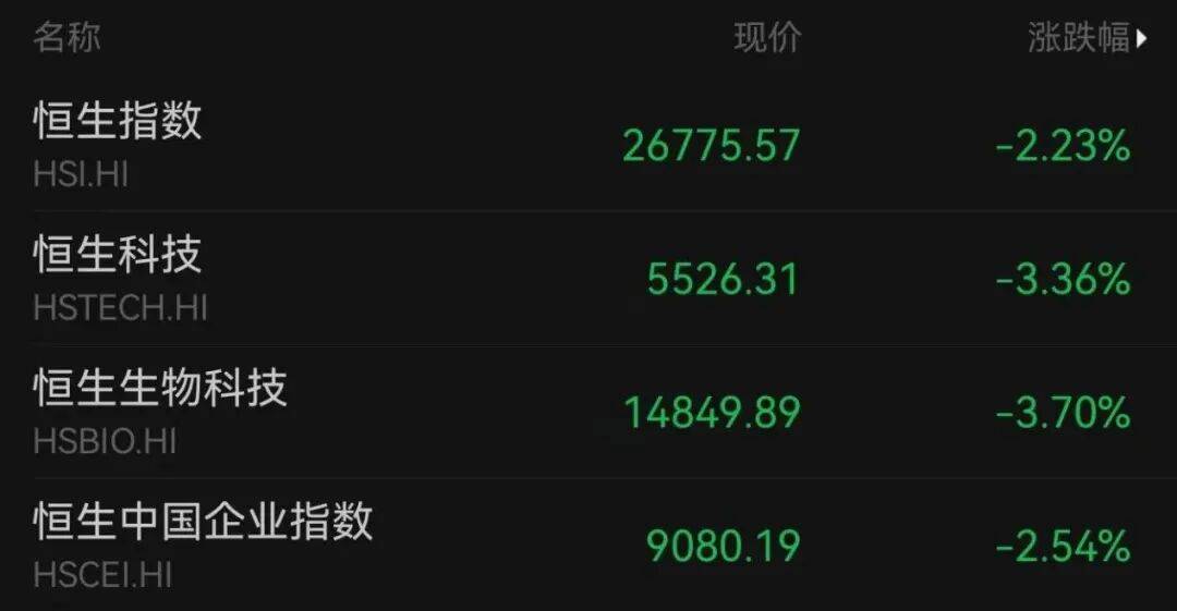 2026年2月2日,截至收盘,恒生指数盘中一度跌超3.2%,最终收跌2.23%,重挫超600点;恒生科技指数盘中一度下挫超4%,最终收跌3.36%;恒生国企指数跌2.54%。今日跌幅超过3%的还有恒生生物科技指数,跌幅为3.70%。