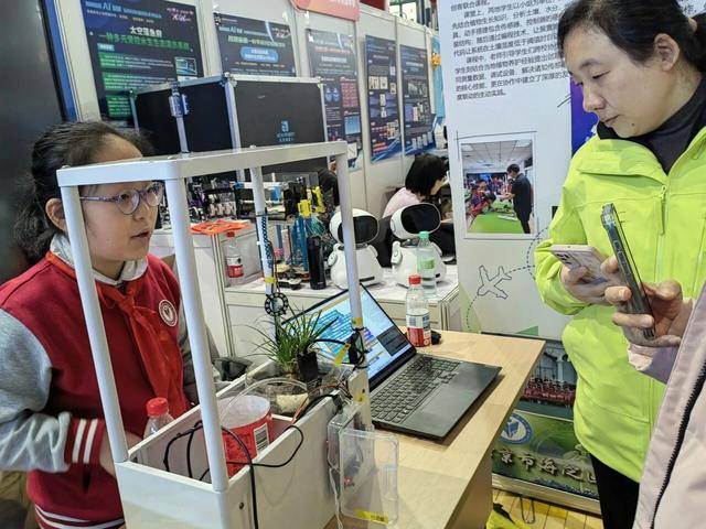 “我们动手搭建了包含传感器控制器的硬件装置,比如为监测土壤湿度的传感器设计专属安装结构,然后再通过编程技术,让装置能根据实时数据自动调节灌溉、光照等操作,系统会在土壤湿度低于阈值时自动启动浇水程序。”在海淀区实验小学展位前,该校五年级学生李婉欣边操作她参与制作的“智能土培系统”,边向参观人员介绍作品的原理和应用情况。