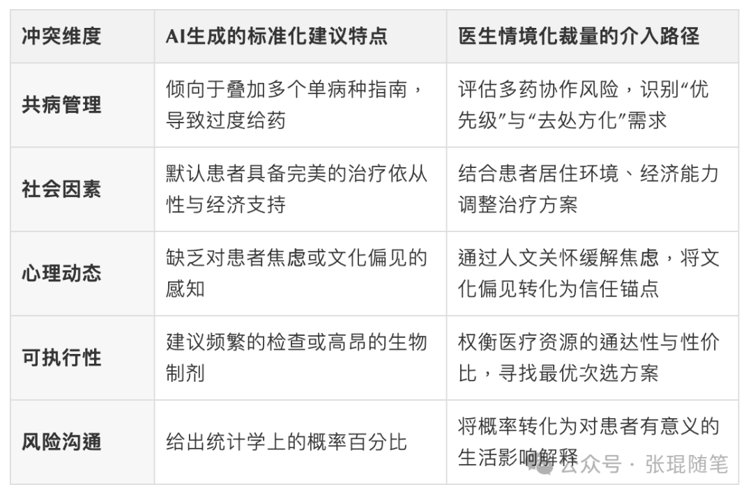 AI虽然强大,但它存在“锯齿状前沿”——可能在复杂的诊断推理上表现卓越,却在简单的逻辑判断上出现低级错误。因此, 医生必须掌握一种名为“情境化裁量”新的核心能力。