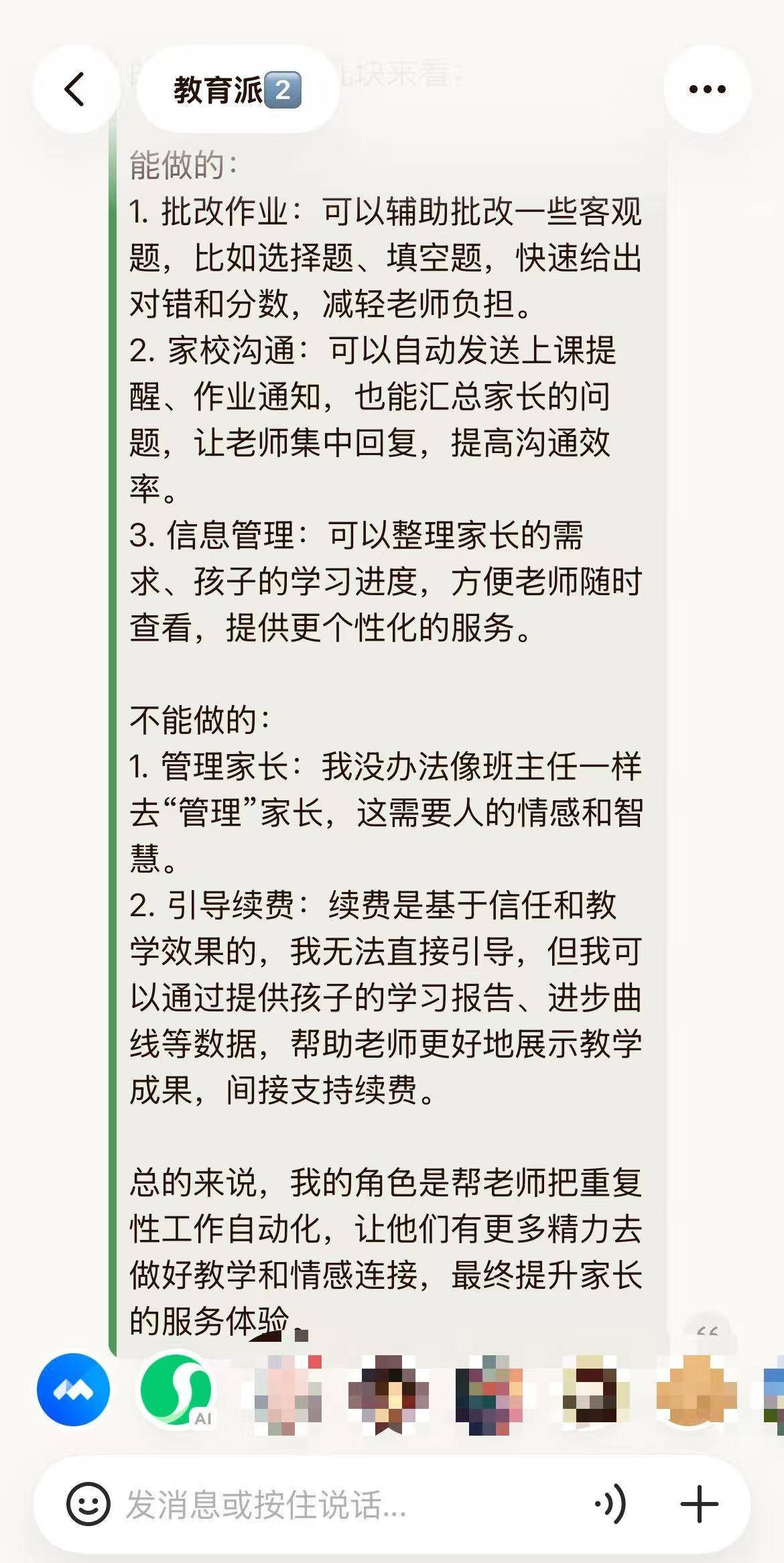 总的来说,我的角色是帮老师把重复性工作自动化,让他们有更多精力去做好教学和情感连接,最终提升家长的服务体验。