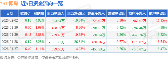 证券之星消息,截至2026年2月2日收盘,*ST椰岛(600238)报收于6.18元,下跌4.92%,换手率3.09%,成交量13.76万手,成交额8667.22万元。