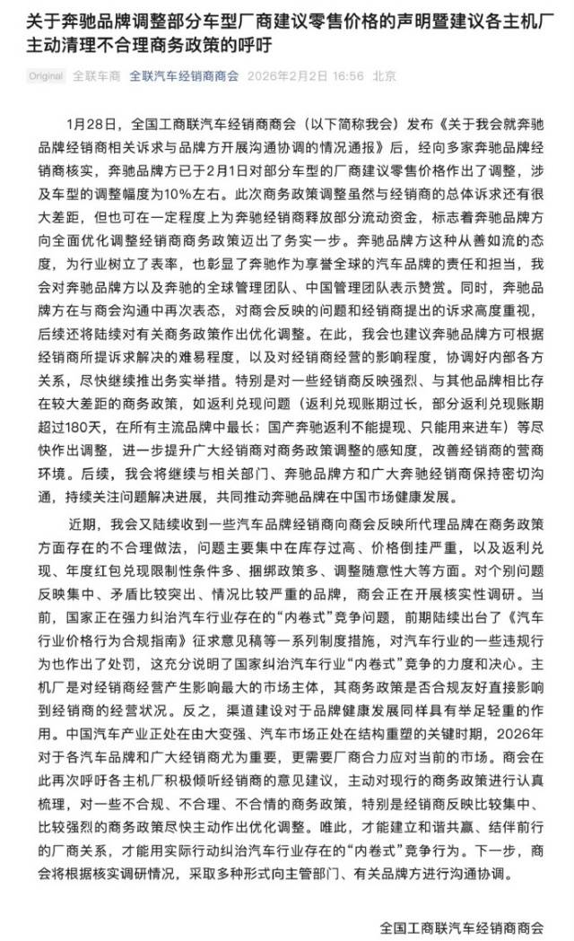 【iMobile爱科技资讯】2月2日,全国工商联汽车经销商商会正式发文,通报了奔驰品牌车型价格调整相关情况。经商会向多家奔驰品牌经销商核实确认,奔驰品牌方已于2月1日对旗下部分车型的厂商建议零售价格进行调整,涉及车型的整体调整幅度约为10%。