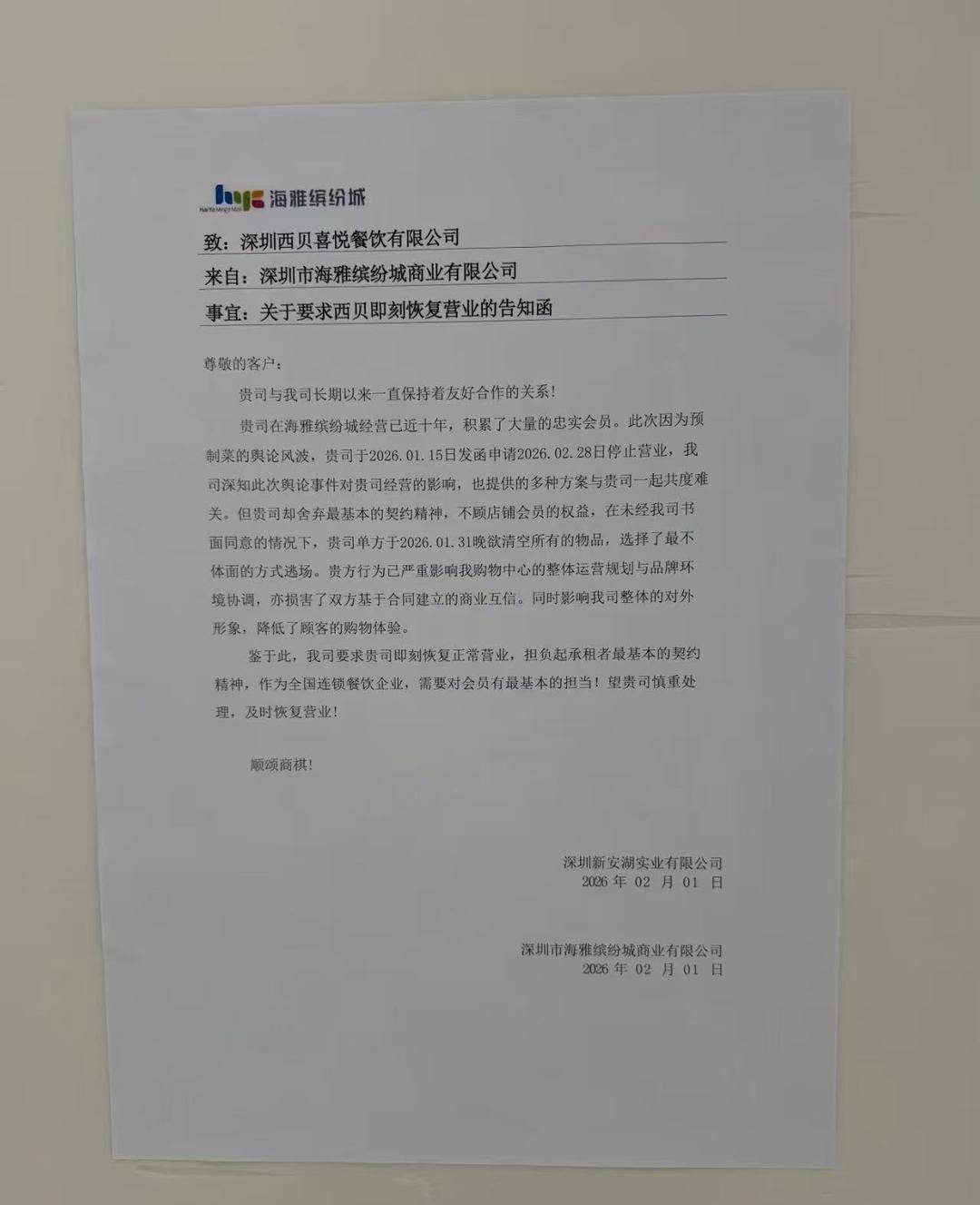 近日,一封抬头为“海雅缤纷城”致深圳西贝喜悦餐饮有限公司的《关于要求西贝即刻恢复营业的告知函》在网上流传。