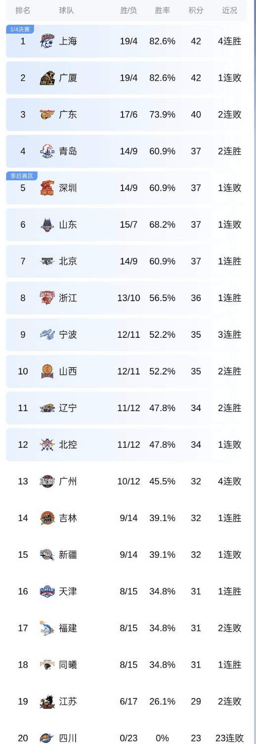 前半程战罢,在当前的CBA积分榜上,上海、广厦同分,上海领跑,广东第3,山东少赛一轮排第5,青岛第4。