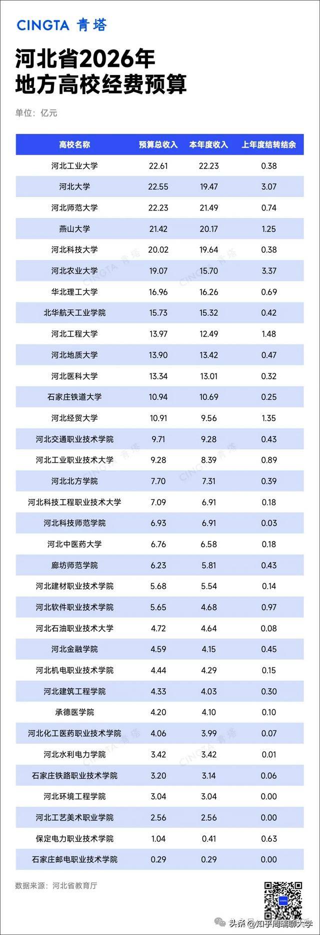 榜单的后半段,特别是预算在5亿元以下的高校,展现的是另一种现实。河北环境工程学院(3.04亿元)、河北工艺美术职业学院(2.56亿元)等,其预算规模仅相当于头部高校的一个零头。保定电力职业技术学院(1.04亿元)的本年度收入甚至仅有0.41亿元,高度依赖上年结转。石家庄邮电职业技术学院(0.29亿元)的预算,则几乎是一个象征性的存在。