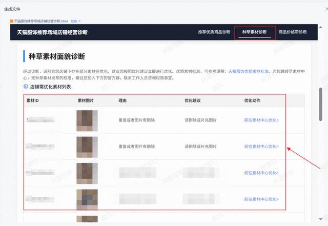 (推荐商机种草素材诊断界面, 注:产品逐步迭代中,页面样式后续可能升级 )