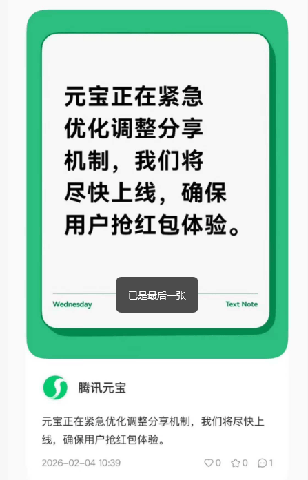 随后,腾讯元宝回应称,元宝正在紧急优化调整分享机制,将尽快上线,确保用户抢红包体验。