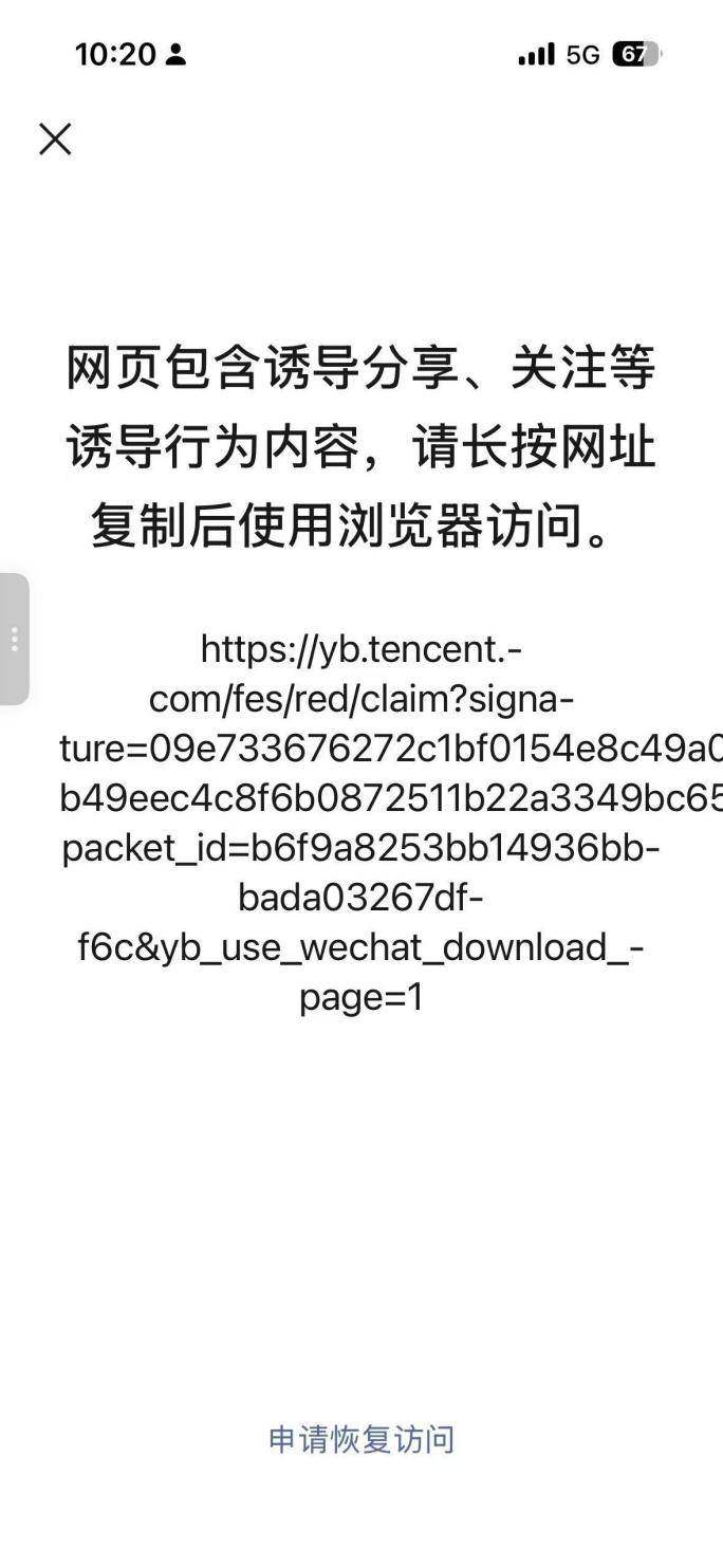 【大河财立方 记者 陈薇】2月4日上午,大河财立方记者发现,微信群内、私发分享的元宝红包链接已无法正常打开,界面显示,网页包含诱导分享、关注等诱导行为内容,请长按网址复制后使用浏览器访问。