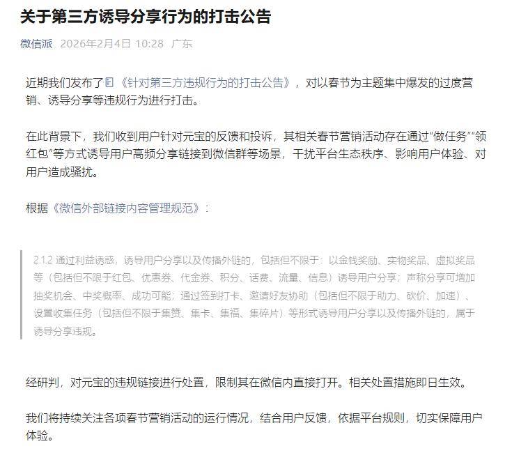 当天上午10:24,微信派发布关于第三方诱导分享行为的打击公告,其中提到,近期微信发布了《针对第三方违规行为的打击公告》,对以春节为主题集中爆发的过度营销、诱导分享等违规行为进行打击。
