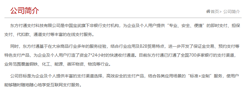 根据官网信息,目前东方付通已打通了全国700多家银行的支付渠道,业务范围覆盖钢铁、化工、能源、循环物资、物流等行业。