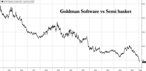 据摩根大通信贷分析师 Kabir Caprihan2月3日发布的最新报告,尽管BDC管理层在过去一年多里持续评估软件业敞口,但在近期软件贷款价格下跌且BDC股价重挫后,市场情绪急剧恶化。高盛的数据显示,软件板块在过去12个交易日中有9日下跌,正测试关键支撑位,且长期表现相对于半导体板块已是一场“史诗级灾难”。