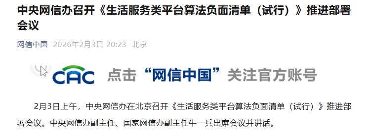 2月3日上午,中央网信办在北京召开《生活服务类平台算法负面清单(试行)》推进部署会议。会议强调,生活服务类平台通过为多方利益主体提供交易撮合、经营场所、信息交流,极大地降低交易成本,满足民生需求,同时也创造了新的就业岗位。算法作为平台生态系统中利益分配调整的主要载体和重要枢纽,在智能匹配供需、改善用户体验、提高运营效率等方面发挥了正向作用,但同时也存在算法黑箱、算法歧视、算法合谋等问题,受到社会各界的高度关注。 制定实施《生活服务类平台算法负面清单(试行)》,就是为了精准有效解决这些问题,让算法更好地服务于社会民生。