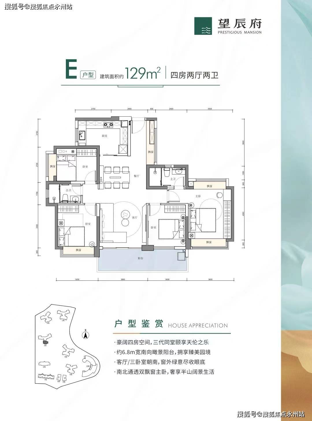 129㎡的4房2厅2卫,设计的是竖厅双龙抱珠格局,客厅3.8米开间,四开间朝南,4个卧室分别是3.6米/3.2米/3米/2.7米的宽度,U型厨房,得房率:81.07%(不含赠送),客厅连接卧室有1个6.8米长的超大阳台,朝正南向看花园景观