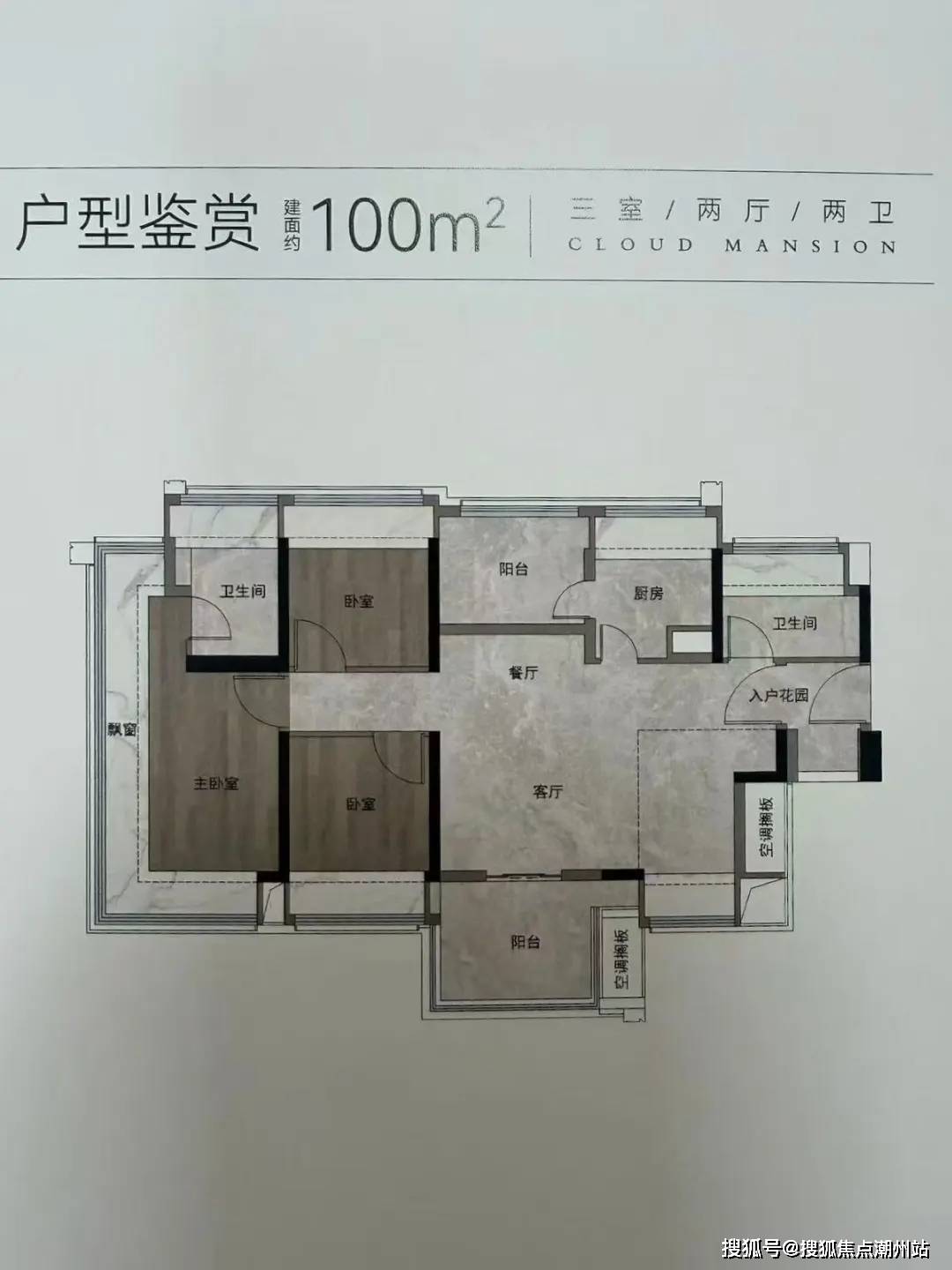 建面约106方,东南朝向四房设计,可以看白云山。做了飞机户型, 主人房和一个次卧能做到270°的大飘窗,景观面更宽。