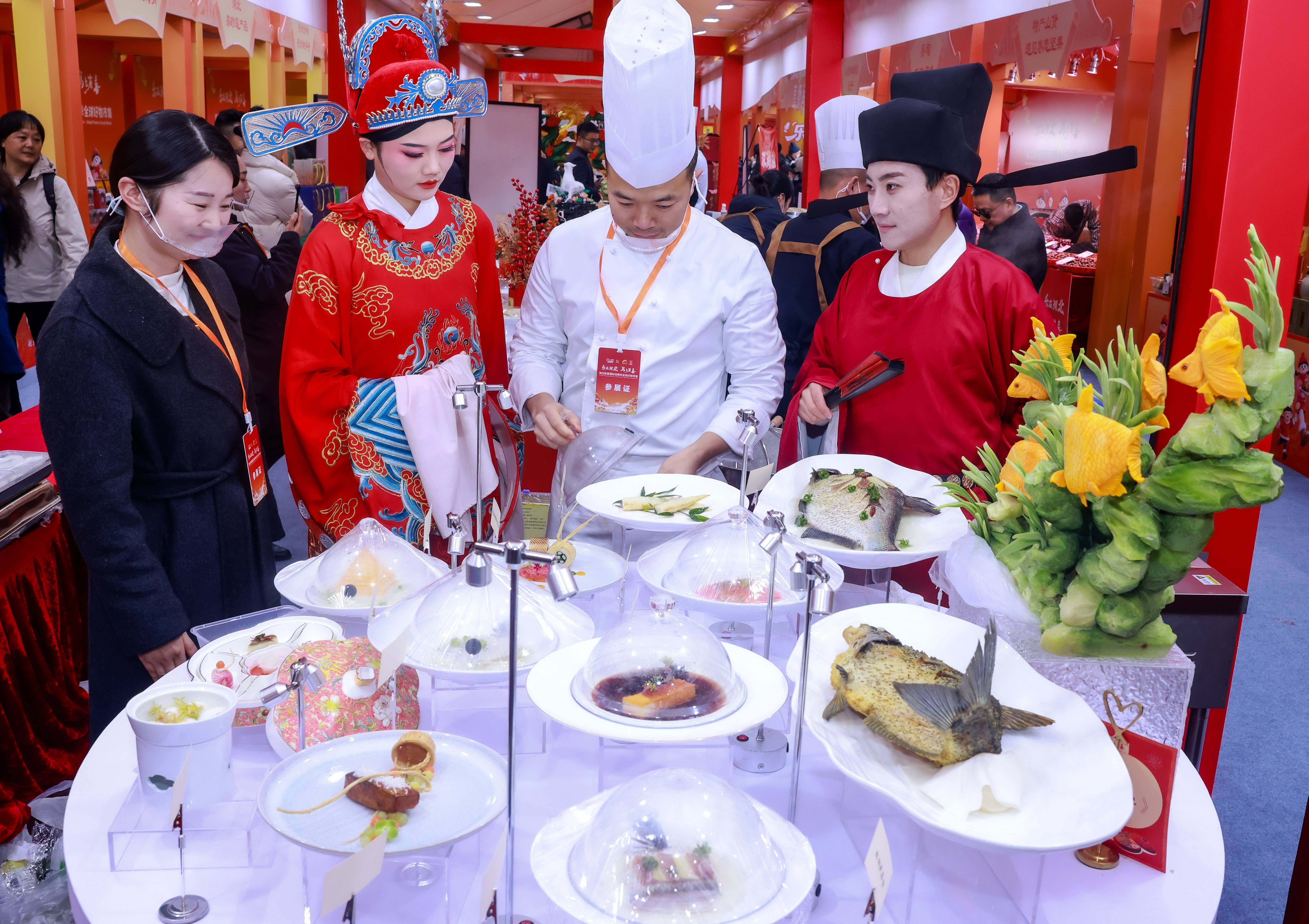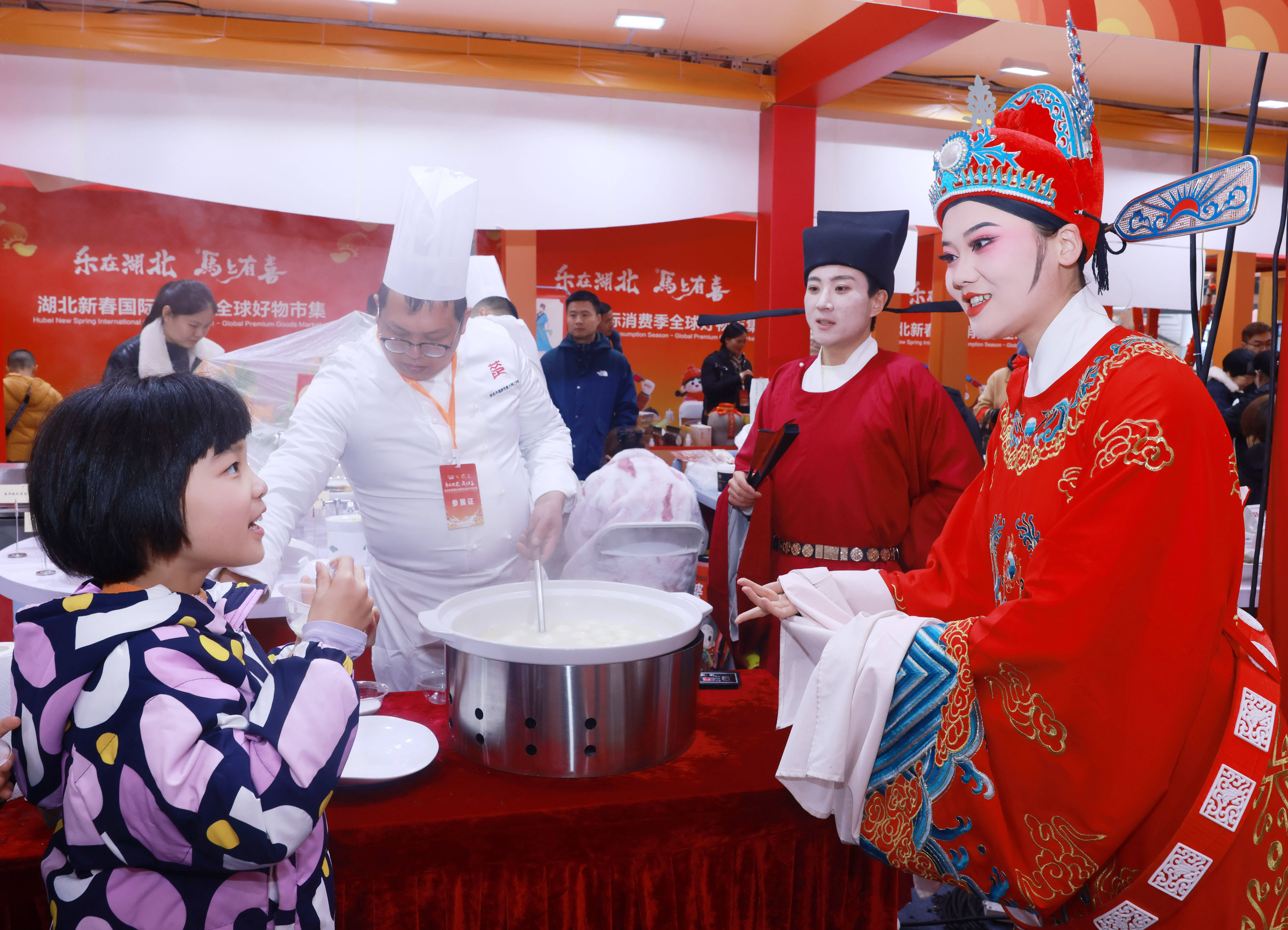 2月5日,在“湖北新春国际消费季”活动现场,黄梅戏演员推介地方特色美食。 新华社发(赵军摄)