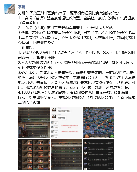 比如据覃宇清回忆,2017年她初入《率土》时,提出过建立史官制度,理由是“《征途》里面就有史官,打江山的帝王都需要有人著书立传”,但游戏内不好实现,就落地到贴吧。如今服务器史官贴已经成了各大率土like游戏的标配。