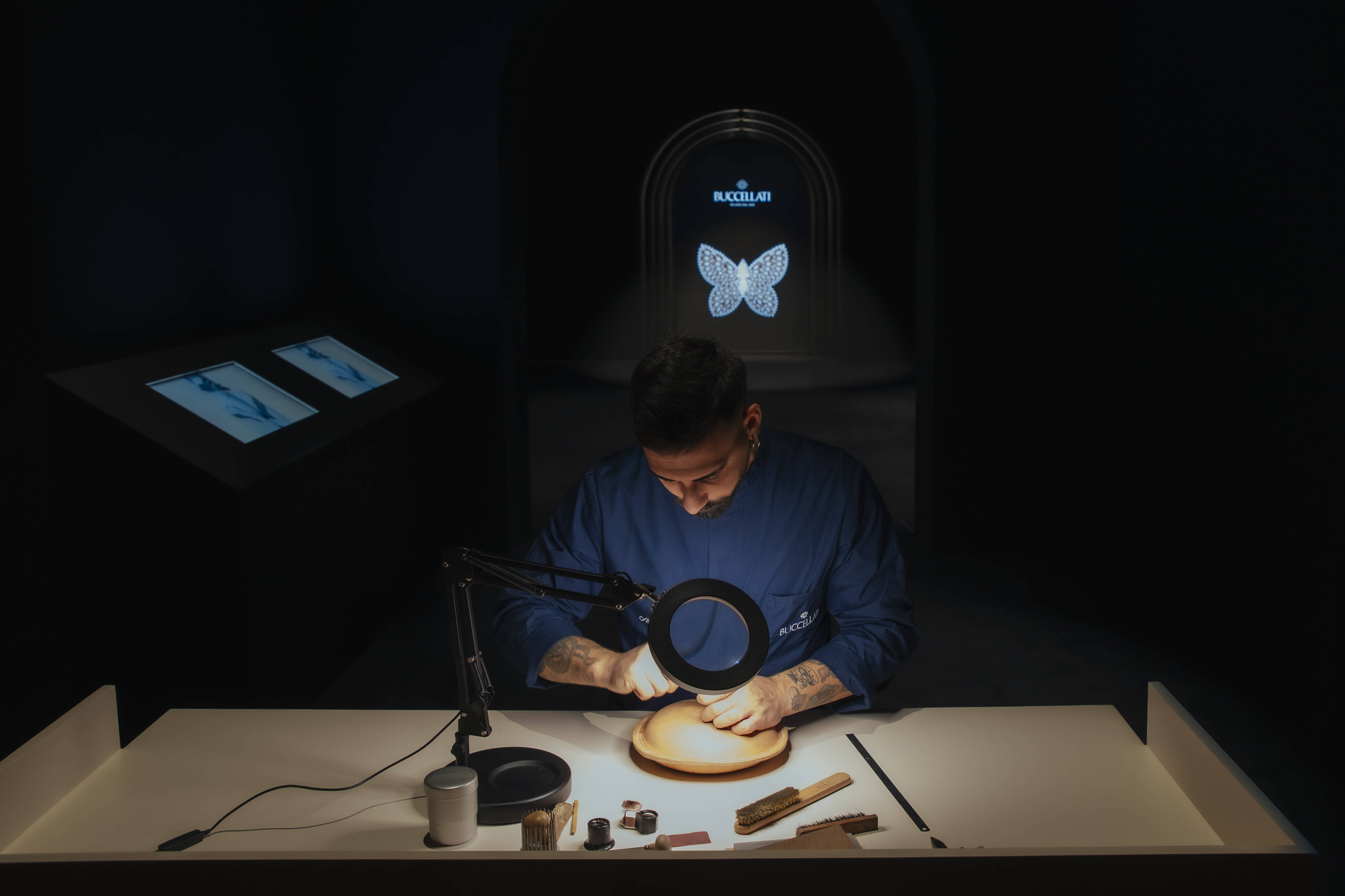 穿过象征蜕变的蝴蝶回廊,仿佛误入Buccellati布契拉提家族私密的精神领地。"扎根意大利的家族传奇"空间被布置成一间充满书卷气的书房,历史照片与泛黄书信交织成一张记忆之网。耳畔响起品牌创始人Mario Buccellati之子Gianmaria Buccellati的原声讲述,略带沙哑的意大利语调,瞬间消弭了百年的时空阻隔。这不再是冷冰冰的品牌叙事,而是关于父亲与儿子、工匠与艺术家、坚守与革新的剧本。珠宝在此退居其次,血脉相连的情感羁绊成为真正主角。伟大品牌的背后,往往是一个家族对某种信念近乎偏执的守护。