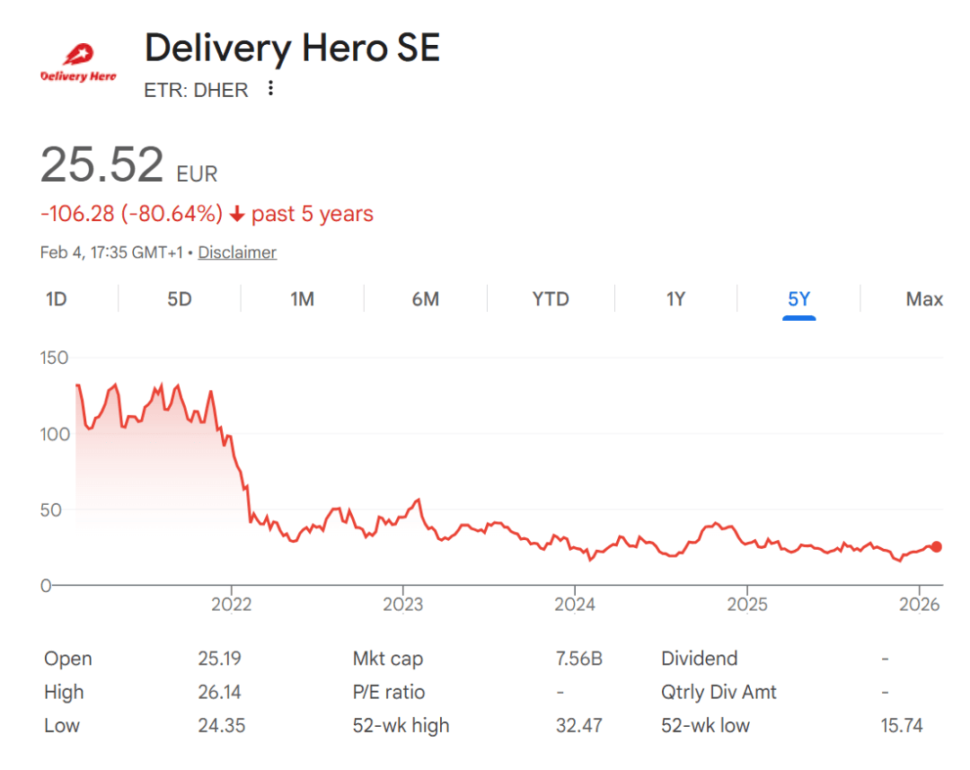此外,DeliveryHero当年收购Baemin时,约四分之三的对价以转股方式完成 - 也就是说团队其实没有拿多少现金。对照今日Baemin的业务表现与母公司股价走势,金奉珍及其韩国团队的心情,恐怕是更加五味杂陈。