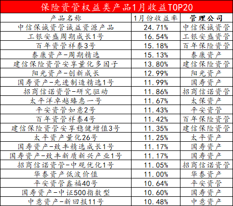 Wind数据显示,今年1月份,在290多款保险资管权益类产品中,超九成产品实现正收益,其中有27款产品收益率超10%。其中,中信保诚资管诚益资源产品收益率约24.71%,位居榜首。