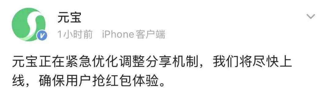 元宝随后通过官方微博回应称,正在紧急优化调整分享机制。新机制将尽快上线,确保用户抢红包体验。