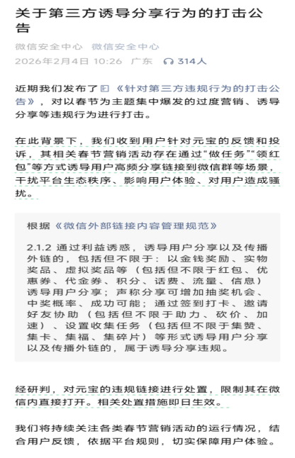 2月4日,“微信安全中心”发布公告,对腾讯旗下元宝App春节营销活动中的诱导分享行为进行处置,限制其违规链接在微信内直接打开,相关措施即日生效。
