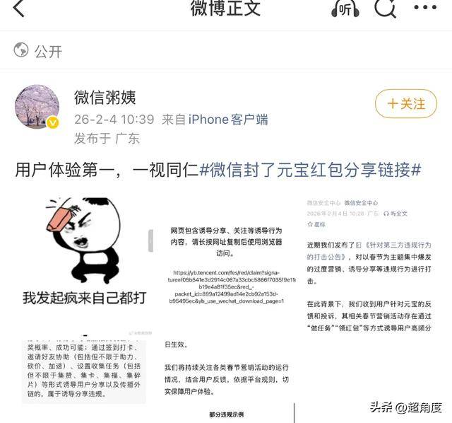 微信安全中心今天发布公告:收到用户针对元宝的反馈和投诉,其相关春节营销活动存在通过“做任务”“领红包”等方式诱导用户高频分享链接到微信群等场景,干扰平台生态秩序、影响用户体验、对用户造成骚扰。