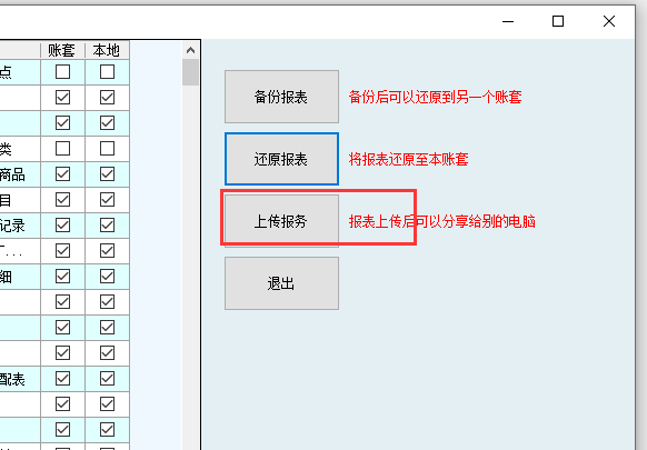 4.勾选要传到另外一个账套的报表(可以勾选全部,但是等待时间比较久,建议只勾选需要传到另一个账套所需的报表即可),点击备份报表,可以备份在桌面。