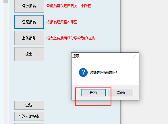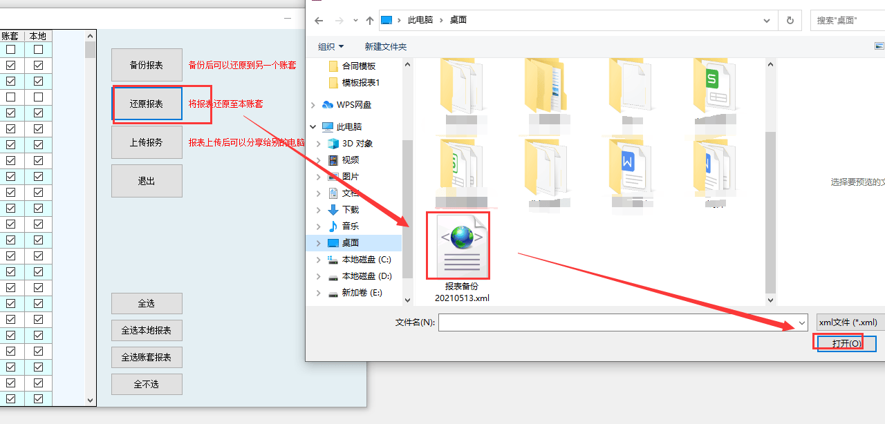 5.切换到没有该报表的账套,点击还原报表,找到之前放在桌面的文件,打开。