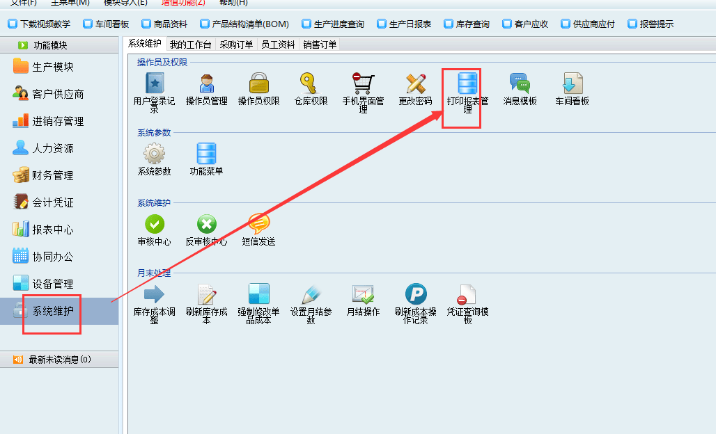 1.在新增或者修改过特定报表的账号里,点击系统维护-打印报表管理。