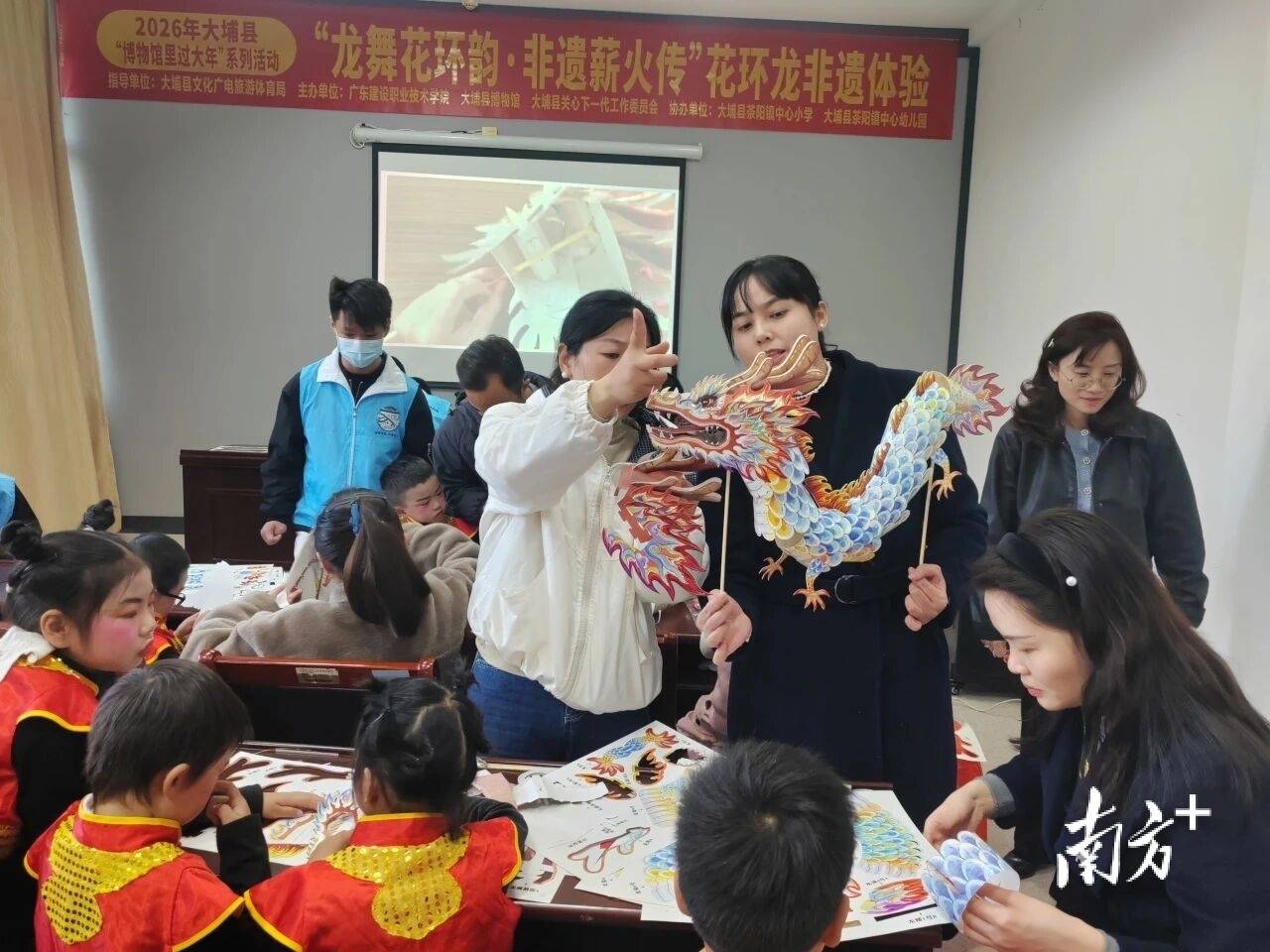 在志愿者们耐心细致的指导下,孩子们围坐一堂,巧用双面胶、热熔棒,亲手制作花环龙,一个个色彩斑斓、造型灵动的花环龙逐渐成型。非遗的活力与新春的喜庆在此刻完美交融。