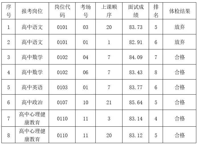 根据《安徽省蚌埠市教育局直属学校2025年冬季“校园招聘”公告》以及《关于发布安徽省蚌埠市教育局直属学校2025年冬季“校园招聘”体检结果及递补考生体检工作的通知》等要求,现将安徽省蚌埠市教育局直属学校2025年冬季“校园招聘”递补考生体检结果通知如下: