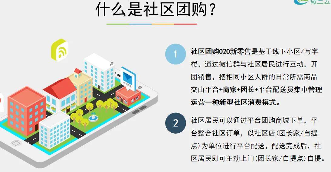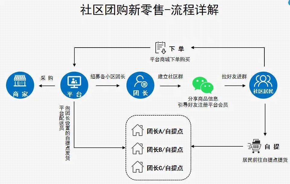 社区团购O2O新零售,是基于线下小区或写字楼,通过微信群与社区居民进行互动,开展团购销售的一种新型社区消费模式。居民可以通过平台团购商城下单,平台整合社区订单,以社区店(团长家/自提点)为单位进行配送。配送完成后,居民可主动上门自提,享受便捷的购物体验。