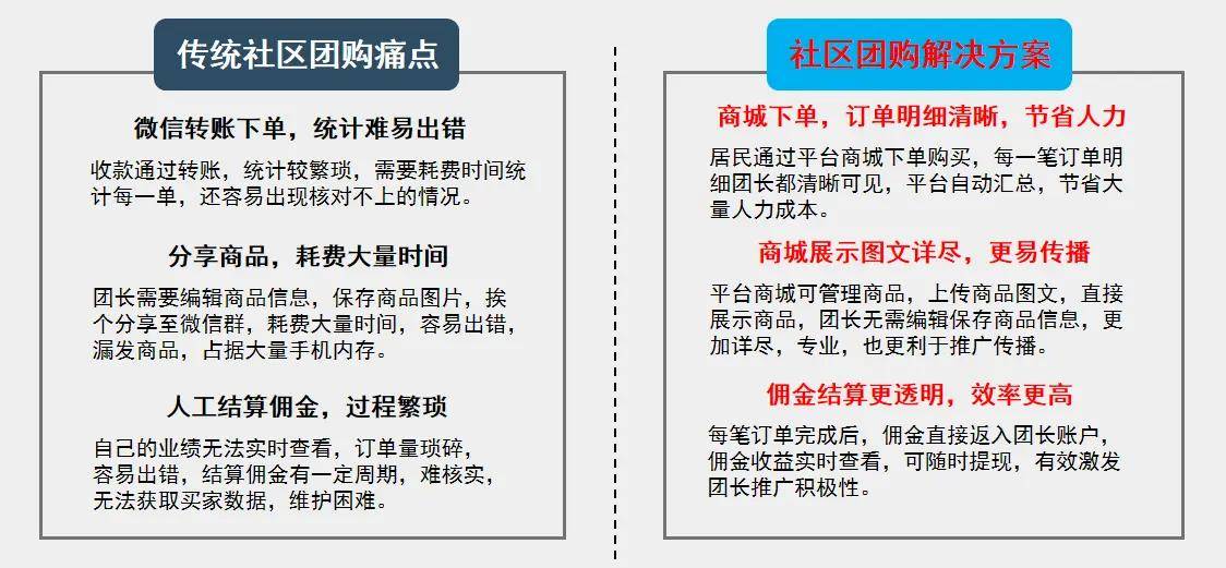 针对团长在佣金结算、商品信息分享等方面的痛点,系统提供了佣金结算透明化、商城下单订单明细清晰等解决方案。团长无需再手动编辑商品信息并挨个分享至微信群,而是直接通过平台商城管理商品并展示图文信息。这种详尽专业的商品展示方式,更有利于推广传播。