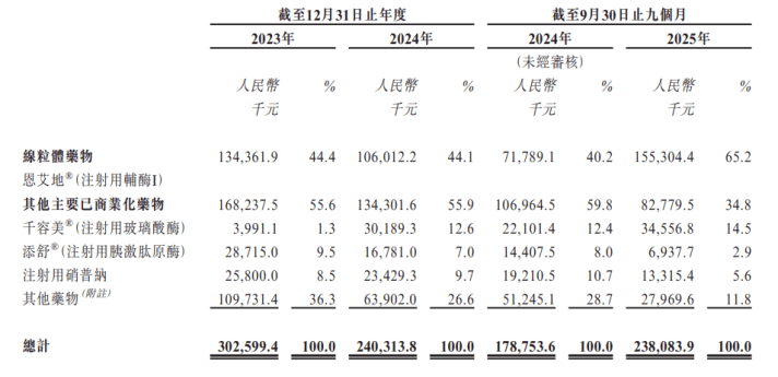 最明显的一个风险点就是“单品依赖”。据招股书,2023、2024年以及2025年前三季度,康诺生物销售恩艾地®的收益分别占同期总收入的44.4%、44.1%及65.2%,其他品类的贡献则比较微薄。虽然该药凭差异化定位,拥有一定市场竞争力,但未来前景不算特别敞亮。