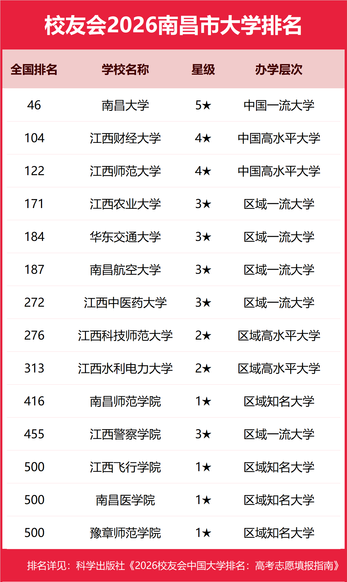 校友会2026南昌市大学排名,南昌大学第一,江西财经大学、江西师范大学前三
