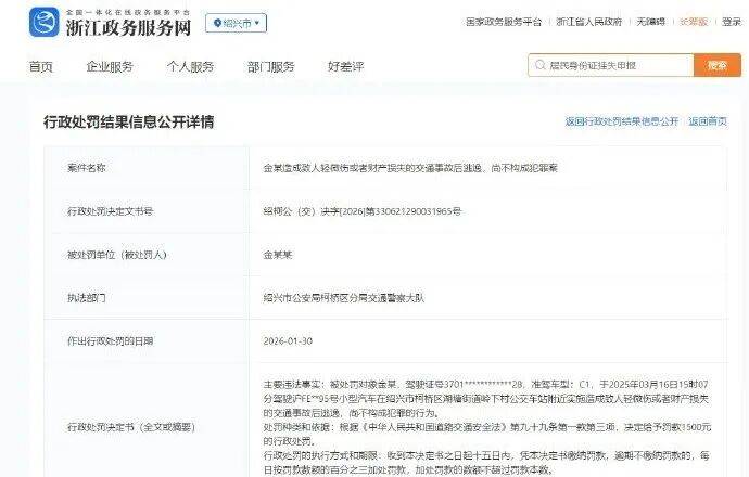 据浙江政务服务网显示,演员金晨因交通肇事逃逸被罚款1500元。