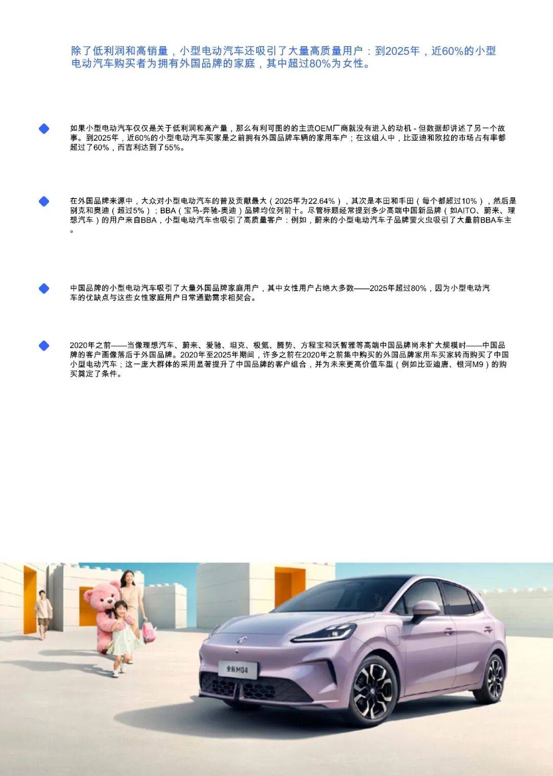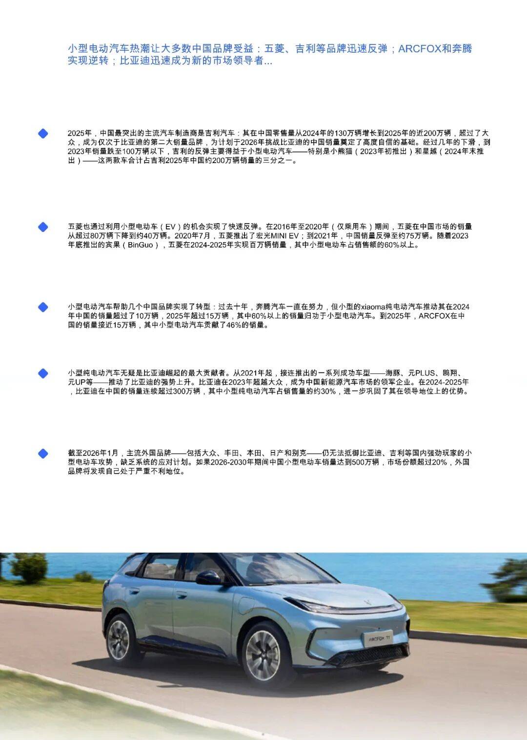 五菱、吉利、比亚迪等品牌借小型电动车反弹:吉利靠小熊猫等车型2025年销量近200万辆,超大众成第二;五菱2024-2025年销量破百万,小型电动车占60%以上;比亚迪小型电动车占其销量30%,巩固领导地位。