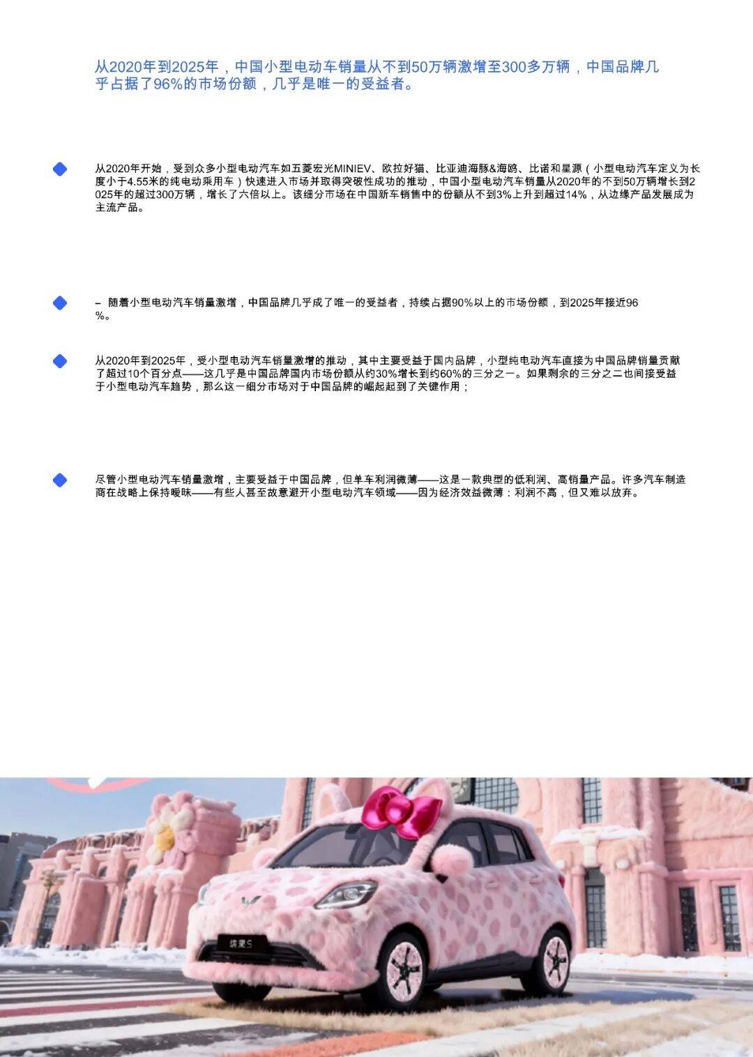 2020-2025年中国小型电动车销量从不足50万辆激增至300多万辆,中国品牌占96%份额,成市场主流。其虽低利润高销量,却是中国品牌崛起关键——直接贡献超10个百分点的销量增长,间接支撑剩余增量。