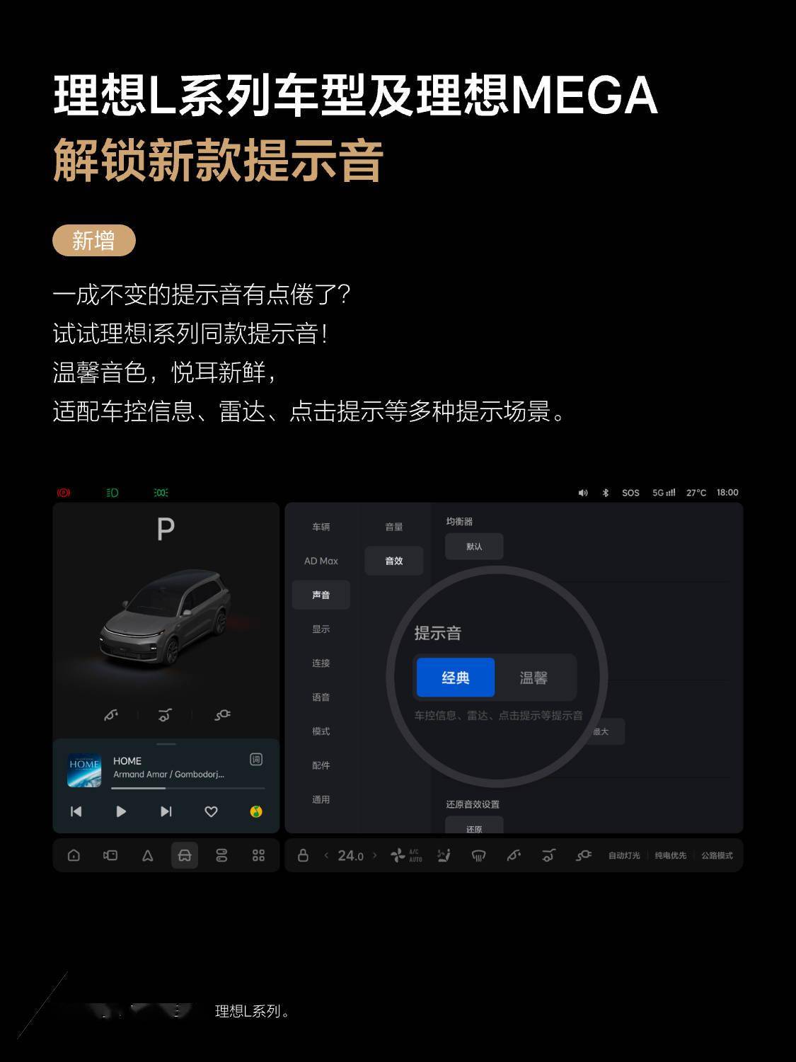 - 理想 L 系列车型及理想 MEGA 解锁新款提示音,适配车控信息、雷达、点击提示等多种提示场景。