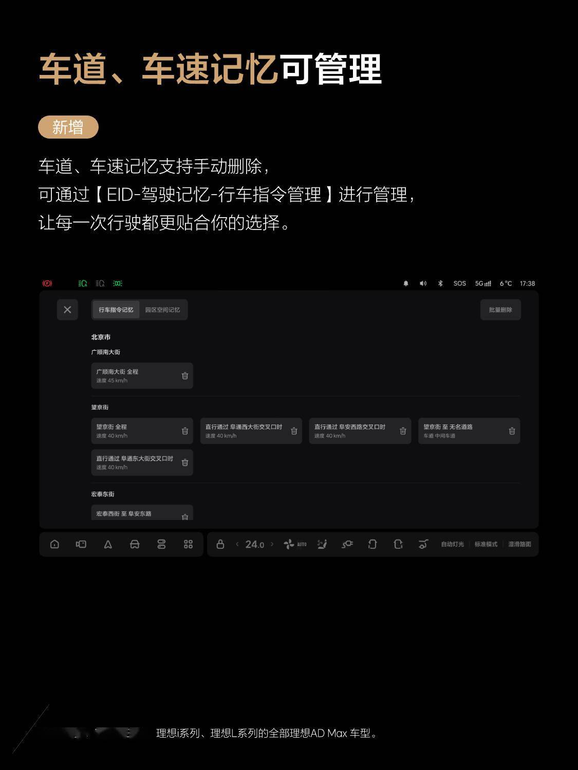 - 车道、车速记忆支持手动删除,可通过“EID-驾驶记忆-行车指令管理”进行管理。