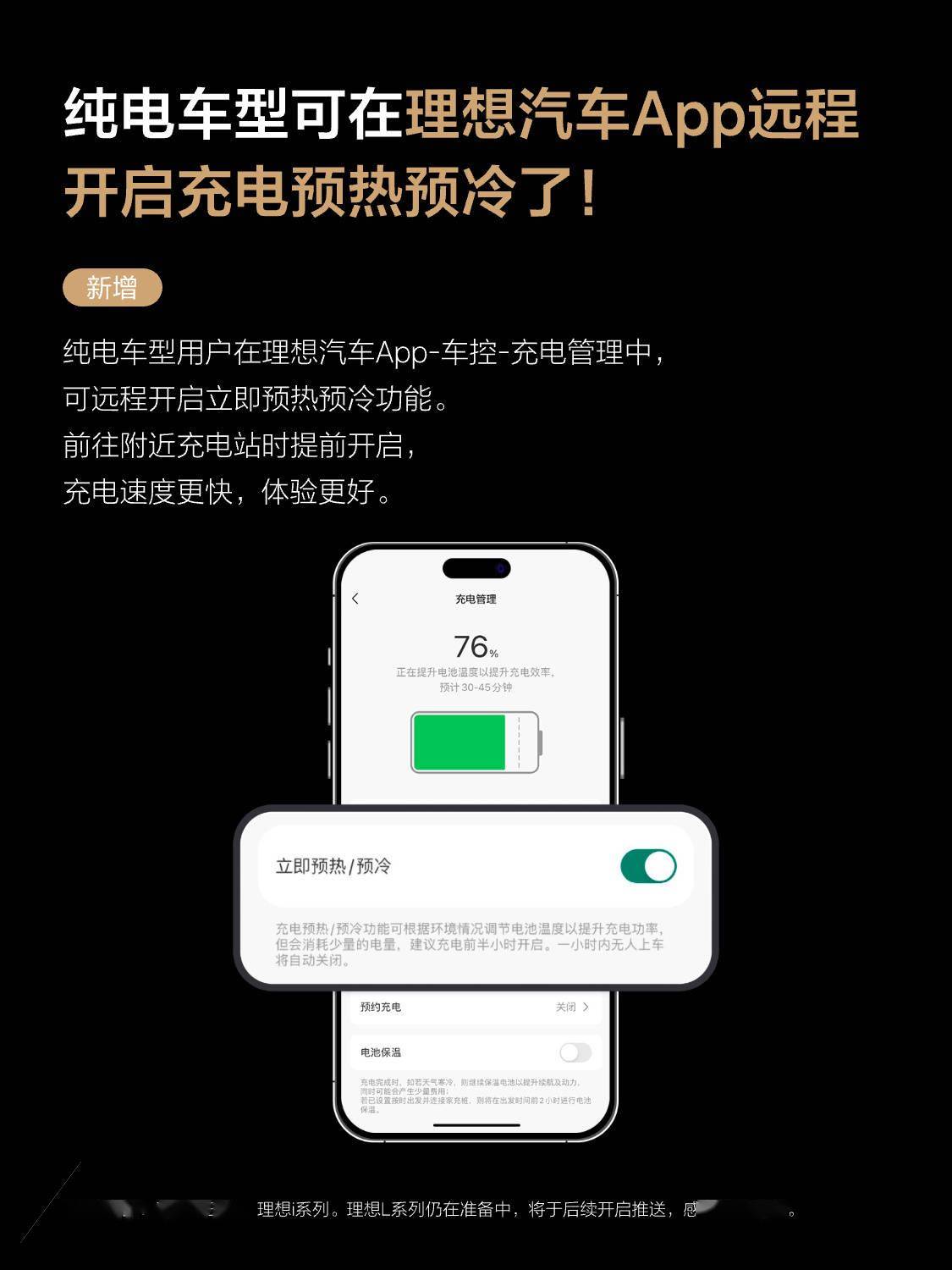 - 纯电车型可在理想汽车 App 远程开启充电预热预冷,前往附近充电站时提前开启,充电速度更快,体验更好。