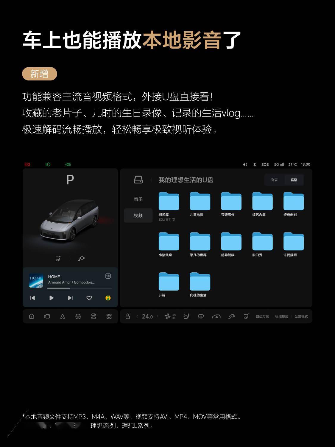 - 车上也能播放本地影音,功能兼容主流音视频格式,外接 U 盘直接看,包括收藏的老片子、儿时的生日录像、记录的生活 vlog 等,极速解码流畅播放。